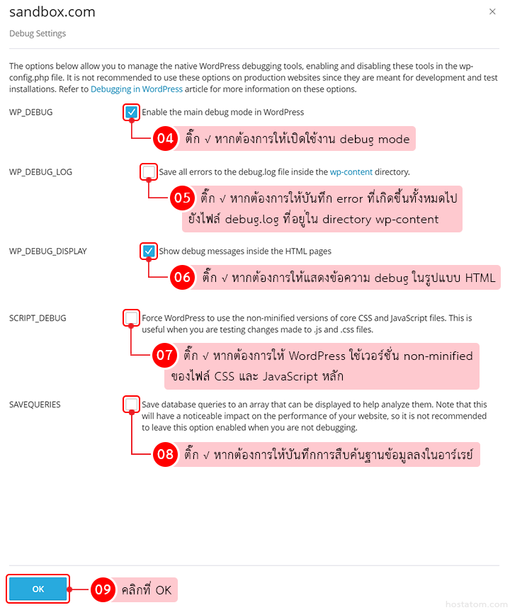 - WP_DEBUG – เปิดใช้งาน debug mode ใน WordPress