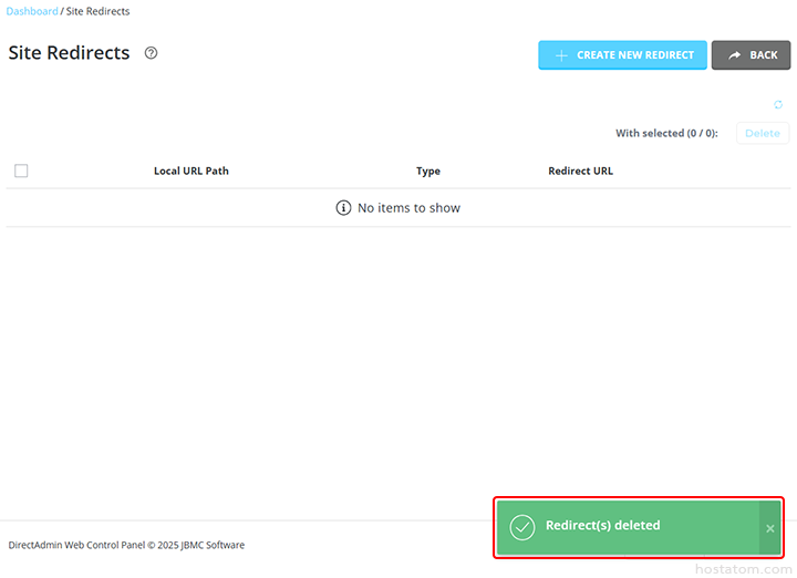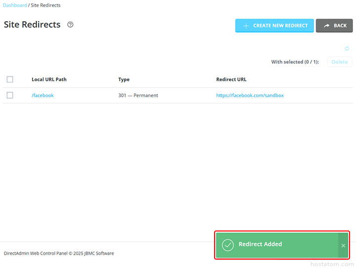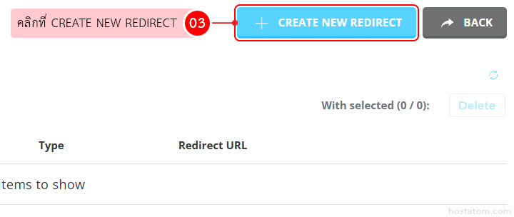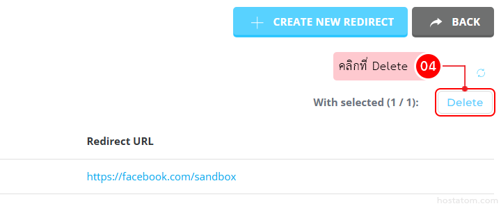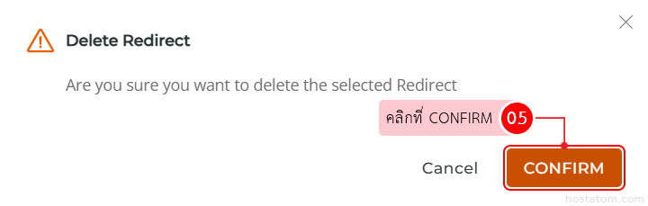 ระบบจะแสดงหน้าต่างยืนยันการลบ redirect ที่เลือก ให้คลิกที่ DELETE