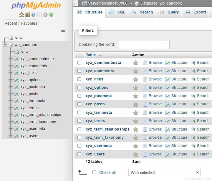 ฐานข้อมูลใน phpMyAdmin จะถูกแสดงขึ้นมา ดังภาพ (สามารถแก้ไขฐานข้อมูลได้ตามต้องการ แต่สำหรับผู้เริ่มต้นหรือไม่ได้เชี่ยวชาญมากพอ ทางเราไม่แนะนำให้แก้ไข)