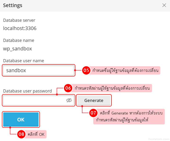 ระบบจะพาไปยังหน้า Settings ให้กำหนดชื่อผู้ใช้ฐานข้อมูลและรหัสผ่านผู้ใช้ฐานข้อมูลที่ต้องการเปลี่ยน (หากต้องการให้ระบบกำหนดรหัสผ่านผู้ใช้ฐานข้อมูลให้ ให้คลิกที่ Generate) เมื่อเสร็จแล้วให้คลิกที่ OK