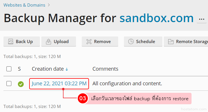 3. ที่หน้า Backup Manager คลิกวันที่ต้องการ restore