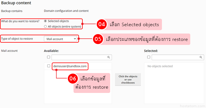 - Type of object to restore: เลือกชนิดของข้อมูลที่ต้องการ เช่น Mail account, Database, Site, DNS zone หรือ Files of Domains