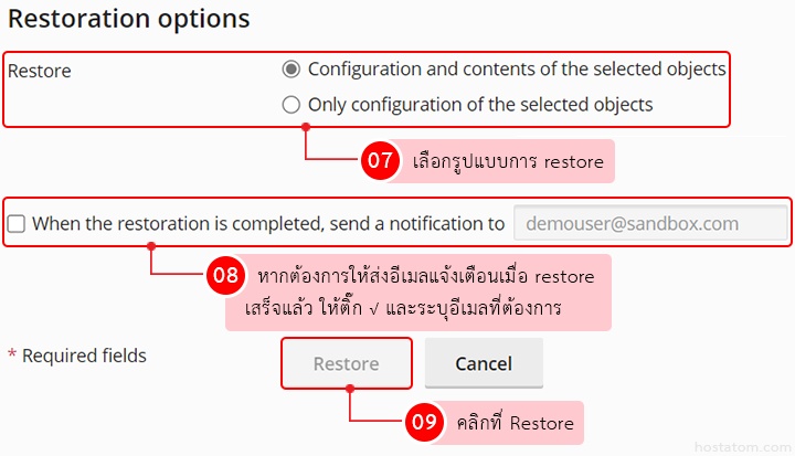 - หากต้องการให้มีการแจ้งเตือนเมื่อการ Restore เสร็จสิ้นแล้ว ให้ติ๊กถูกหน้าข้อความ When the restoration is completed, send a notification to พร้อมใส่ชื่ออีเมลที่ต้องการ