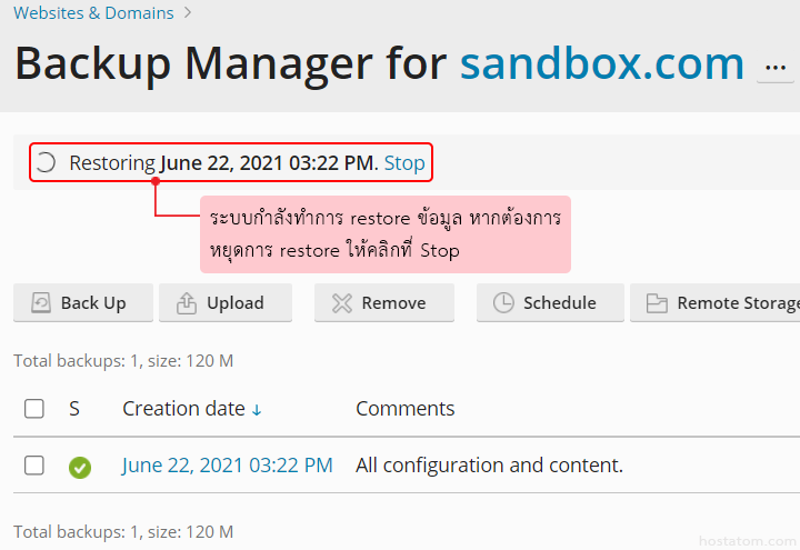 - หากไม่ต้องการใช้งานโดเมนระหว่างการ restore ให้ติ๊กถูกหน้าข้อความ Suspend domains until the restoration is complete