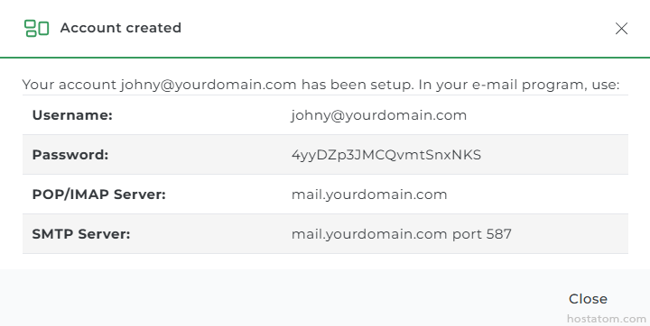 นอกจากนี้ ในหน้าต่างแจ้งเตือนจะแสดงข้อมูล POP/IMAP Server และ SMTP Server ซึ่งสามารถนำไปใช้ตั้งค่าอีเมลบนโปรแกรมหรืออุปกรณ์อื่น ๆ เช่น Outlook, Thunderbird, โทรศัพท์มือถือ หรือ Tablet ได้