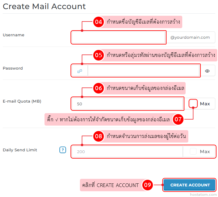 กรอกรายละเอียดของบัญชีอีเมลที่ต้องการสร้าง เมื่อเสร็จแล้วให้คลิกที่ CREATE ACCOUNT