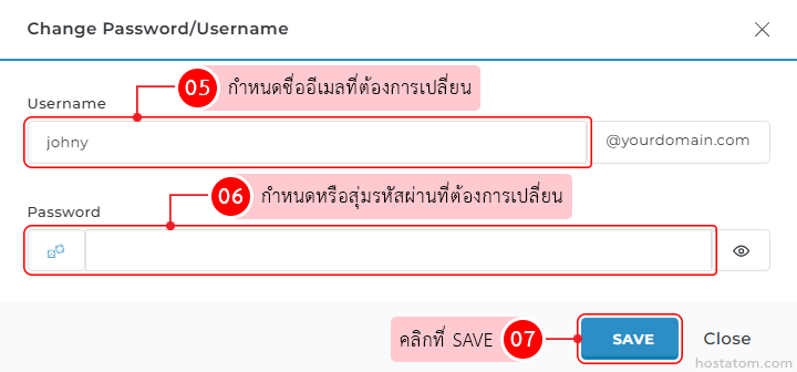 กำหนดชื่ออีเมลที่ต้องการเปลี่ยนในช่อง Username หรือกำหนดรหัสผ่านที่ต้องการเปลี่ยนในช่อง Password (รหัสผ่านที่เปลี่ยนนั้นควรหลีกเลี่ยงการใช้รหัสผ่านที่คาดเดาได้ง่าย) จากนั้นคลิก SAVE