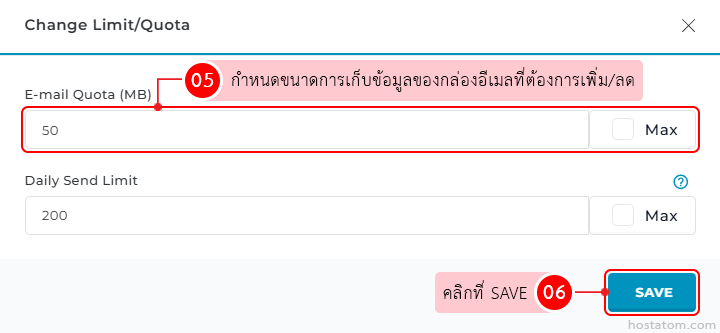 กำหนดขนาดการเก็บข้อมูลของกล่องอีเมลที่ต้องการเพิ่ม/ลดใน E-mail Quota (MB) หรือติ๊กถูกที่ Max หากต้องการให้ขนาดการเก็บข้อมูลของกล่องอีเมลไม่จำกัด จากนั้นคลิกที่ SAVE