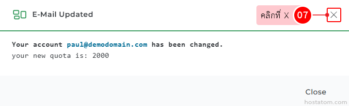 ระบบจะแจ้งว่าได้เปลี่ยน e-mail quota ของอีเมลดังกล่าวเรียบร้อยแล้ว ให้คลิกที่ X เพื่อปิดหน้าต่างแจ้งเตือน