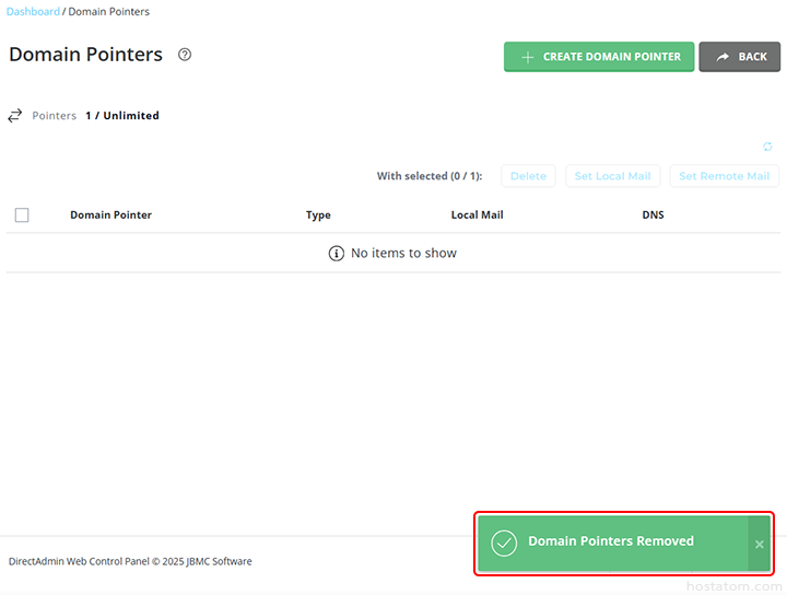 ระบบจะแจ้งว่า domain pointer ดังกล่าวได้ถูกลบแล้ว