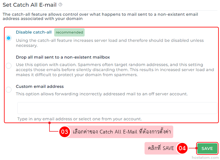- Disable catch-all : ปิดใช้งานฟีเจอร์ Catch All E-mail (ถูกเลือกไว้ในค่าเริ่มต้น)