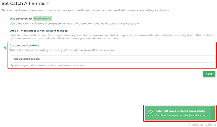 ระบบจะแจ้งว่าได้ตั้งค่า Catch-All E-Mail เป็นค่าที่เลือกแล้ว โดยจากรูปตัวอย่างจะเป็นการตั้งค่า Catch-All E-Mail ให้ส่งไปยังอีเมล sales@sandbox.com