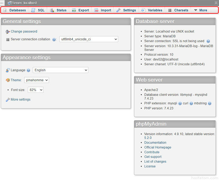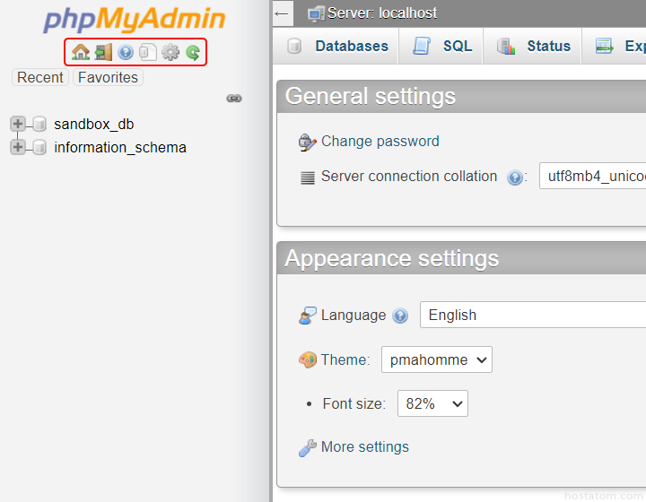 • ไอคอน Home – พามายังหน้าหลักของ phpMyAdmin