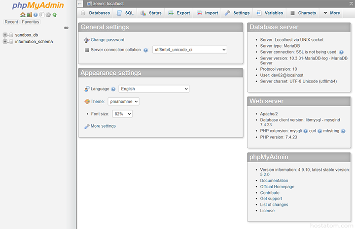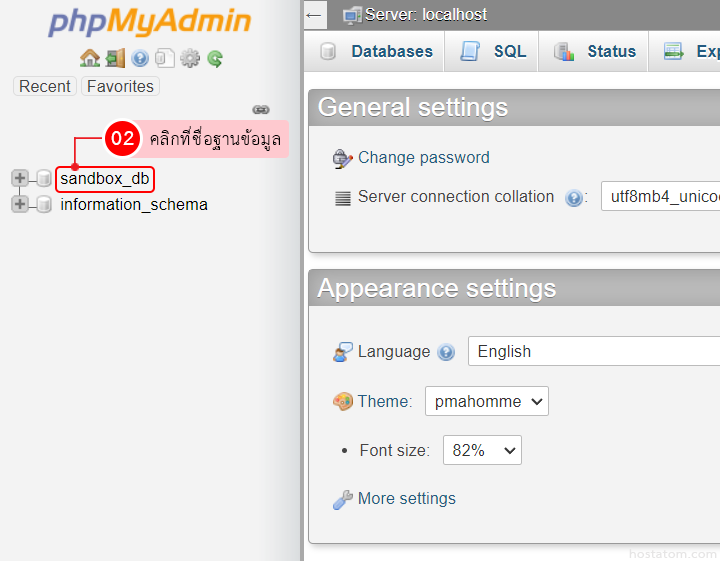 สังเกตที่ฝั่งซ้ายของหน้าหลักใน phpMyAdmin