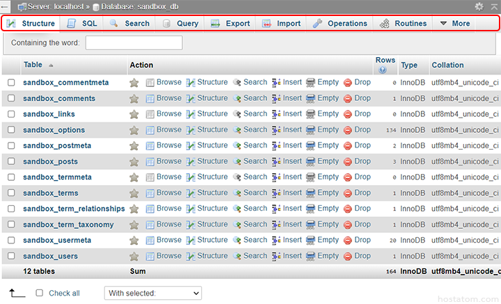• Structure – แสดงรายละเอียดของตารางฐานข้อมูล (table) ทั้งหมดที่มีอยู่ในฐานข้อมูลนั้นๆ นอกจากนี้ยังสามารถใช้สร้างและลบตารางฐานข้อมูลได้อีกด้วย