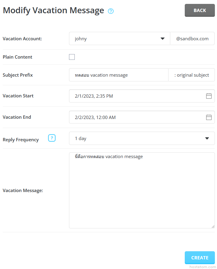 Vacation message เป็นอีกหนึ่งการตั้งค่าข้อความตอบกลับอัตโนมัติ ที่เมื่อมีการส่งอีเมลเข้ามาบัญชีอีเมลปลายทางที่ได้ตั้ง vacation message ไว้ ระบบจะทำการส่งข้อความตอบกลับไปยังบัญชีอีเมลที่ได้ทำการส่งอีเมลเข้ามาตามที่ได้ตั้งค่าไว้ vacation message จะใช้สำหรับผู้ใช้ที่ไม่สามารถตอบข้อความที่ส่งมาได้ในทันทีหรือในช่วงเวลาหนึ่ง เช่น การเดินทางไปต่างประเทศที่ไม่สามารถใช้งานอินเทอร์เน็ตได้เป็นระยะเวลาหลายวัน หรือระหว่างวันหยุดทำการต่างๆ เป็นต้น โดยการใช้งาน vacation message ใน control panel ของ DirectAdmin จะมีอยู่ 3 วิธี ได้แก่