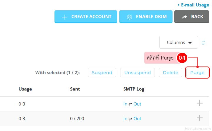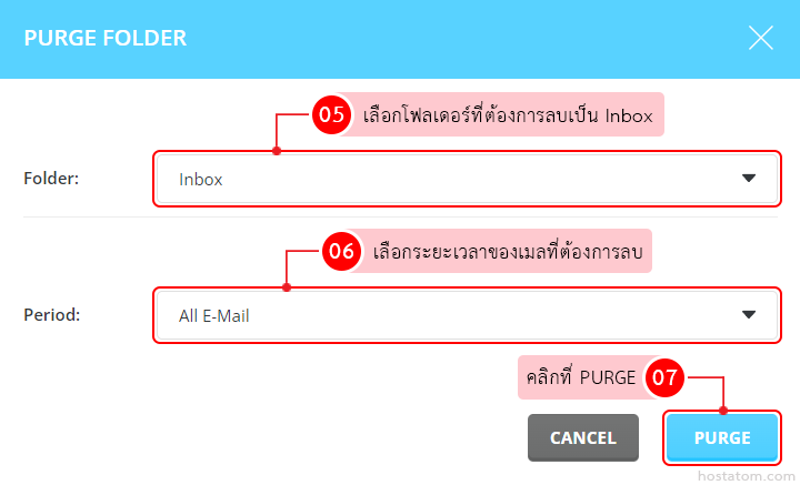 เลือกโฟลเดอร์ที่ต้องการลบในหัวข้อ Folder เป็น Inbox และเลือกระยะเวลาของเมลที่ต้องการลบในหัวข้อ Period ตามต้องการ โดยจะมีตั้งแต่ลบอีเมลทั้งหมด และลบอีเมลที่เก่ากว่าตั้งแต่ 3 วันไปจนถึง 3ปี (1095 วัน) จากนั้นคลิกที่ PURGE