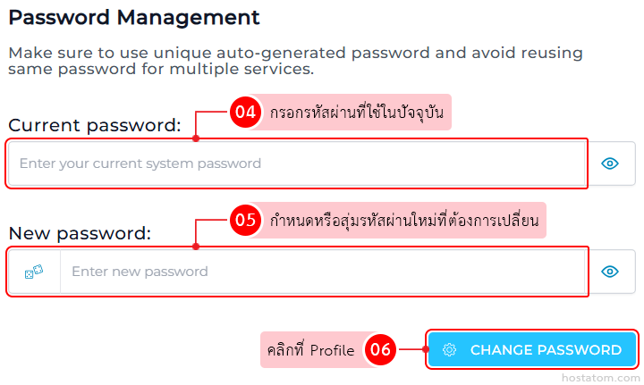 กำหนดรายละเอียดการเปลี่ยนรหัสผ่านในหมวด Password Management เมื่อเสร็จแล้วให้คลิกที่ CHANGE PASSWORD