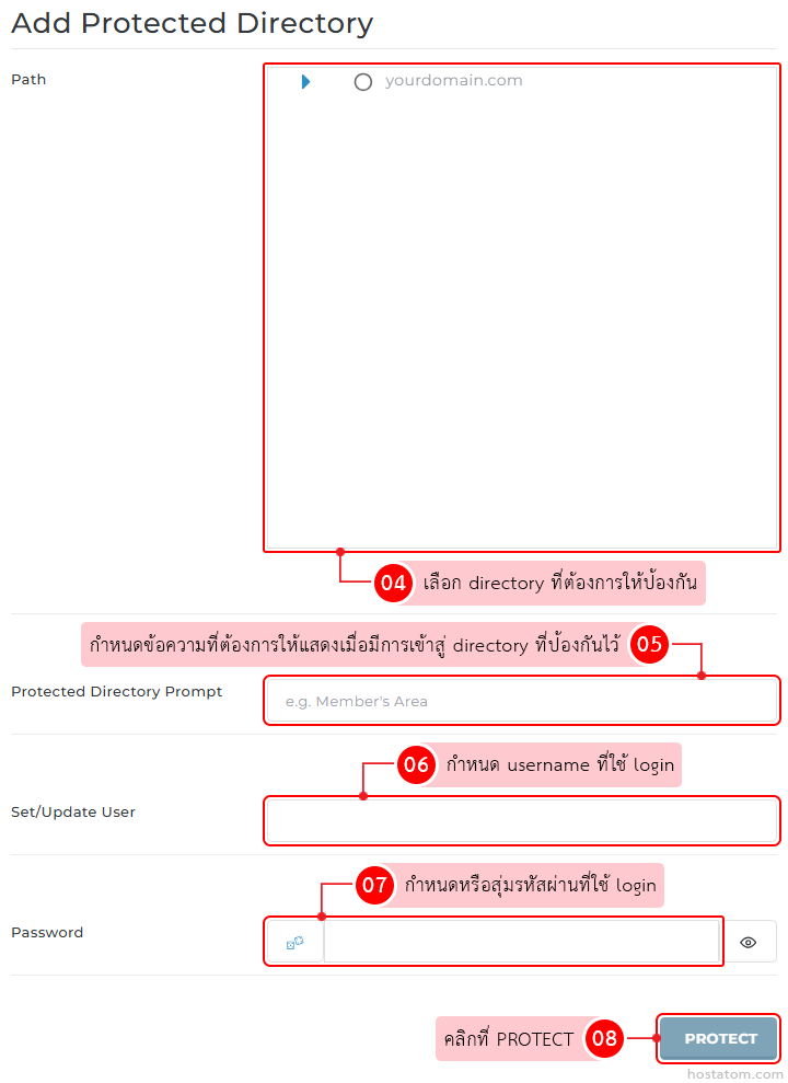 กำหนดค่าที่จะใช้ป้องกัน directory เมื่อเสร็จแล้วให้คลิกที่ PROTECT