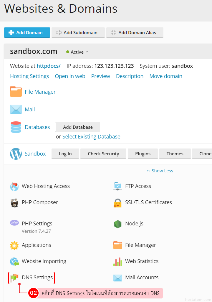 คลิกที่ DNS Settings ในโดเมนที่ต้องการตรวจสอบค่า DNS