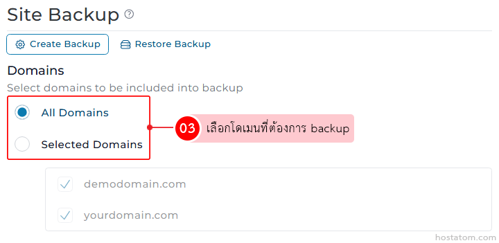 เลือกโดเมนที่ต้องการสำรองข้อมูลในหัวข้อ Domains โดยจะมีให้เลือกอยู่ 2 แบบ ได้แก่