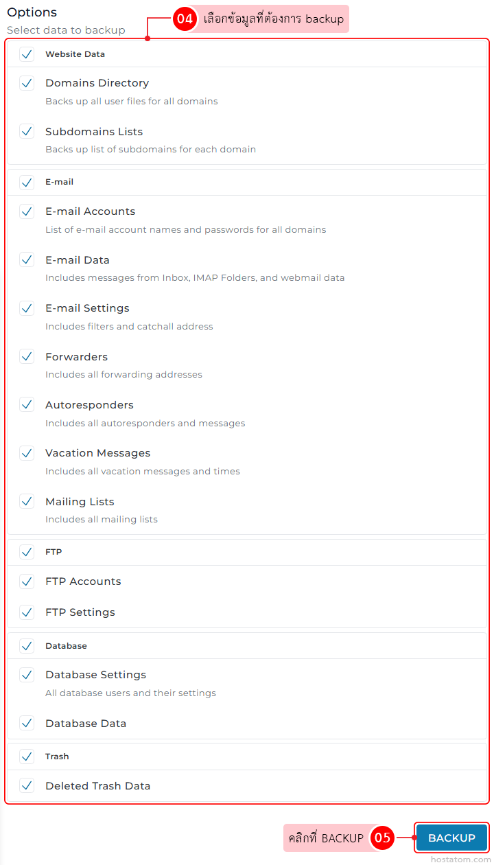 เลือกข้อมูลที่ต้องการ backup ในหัวข้อ Options เมื่อเสร็จแล้วให้คลิกที่ BACKUP
