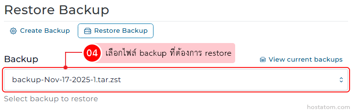 เลือก backup ที่ต้องการ restore ในหัวข้อ Backup