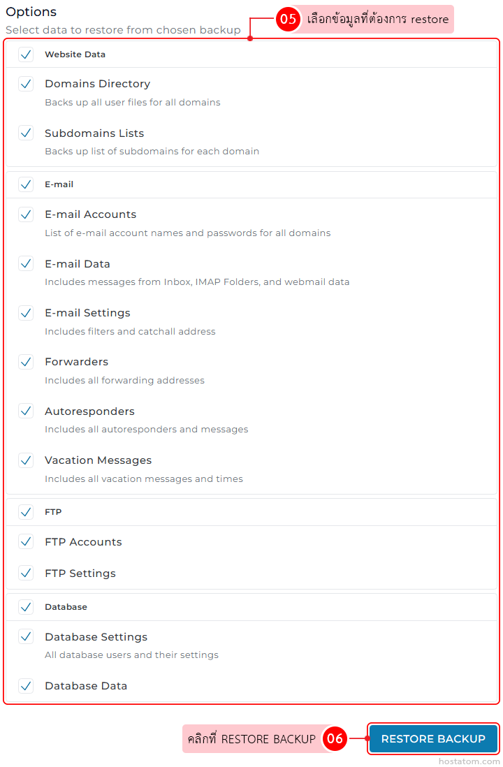 เลือกข้อมูลที่ต้องการ restore ในหัวข้อ Options เมื่อเสร็จแล้วให้คลิกที่ RESTORE BACKUP