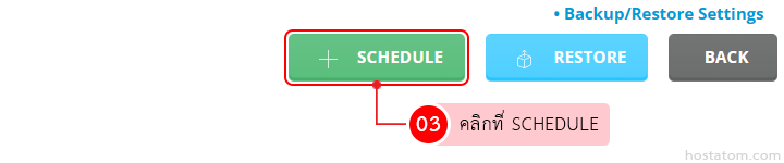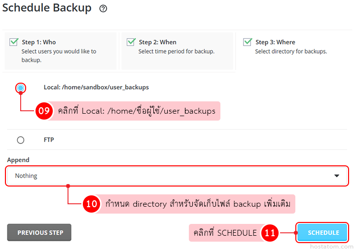เลือกการจัดเก็บข้อมูล backup เป็น Local และกำหนด directory สำหรับจัดเก็บไฟล์ backup เพิ่มเติม (ไม่บังคับ) จากนั้นคลิกที่ SCHEDULE