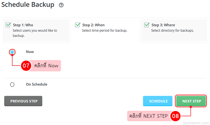 เลือกกำหนดเวลา backup ข้อมูลเป็น Now จากนั้นคลิกที่ NEXT STEP