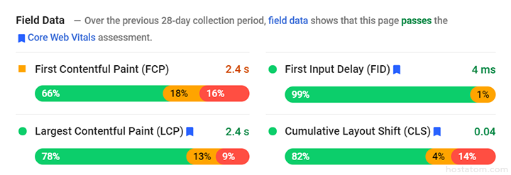 โดยแถบสีเขียว สีเหลือง สีแดง นั้นจะหมายถึงจำนวนเปอร์เซนต์เวลาในการโหลด โดยจะแบ่งเป็นดี ต้องปรับปรุง และแย่ ยกตัวอย่างเช่น ค่า FCP มีค่าเปอร์เซนต์เป็น 68%(เขียว), 28% (ส้ม) และ 4% (แดง) ตามลำดับ ซึ่งหมายความว่า 68% ของหน้าเพจใช้เวลาในการโหลดในระดับดี คือใช้เวลาน้อยกว่า 1s 14% ของหน้าเพจใช้เวลาในการโหลดในระดับที่ต้องปรับปรุง คือใช้เวลาตั้งแต่ 1s-3s และ 8% ของหน้าเพจใช้เวลาในการโหลดอยู่ในระดับแย่ คือใช้เวลามากกว่า 3s