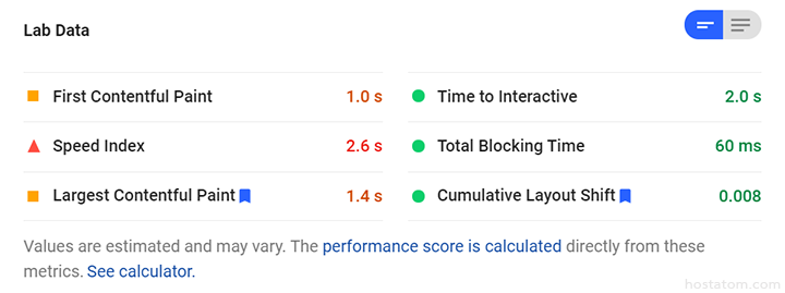 Lab Data เป็นข้อมูลจำลองความเร็วในการโหลดหน้าเว็บไซต์แบบประมาณการ โดยจะแสดงผลการวิเคราะห์ First Contentful Paint, Largest Contentful Paint, Speed Index, Cumulative Layout Shift, Time to Interactive, และ Total Blocking Time โดยแต่ละตัววัดจะแสดงเวลาและสีกำกับ ซึ่งแต่ละสีมีความหมายดังนี้