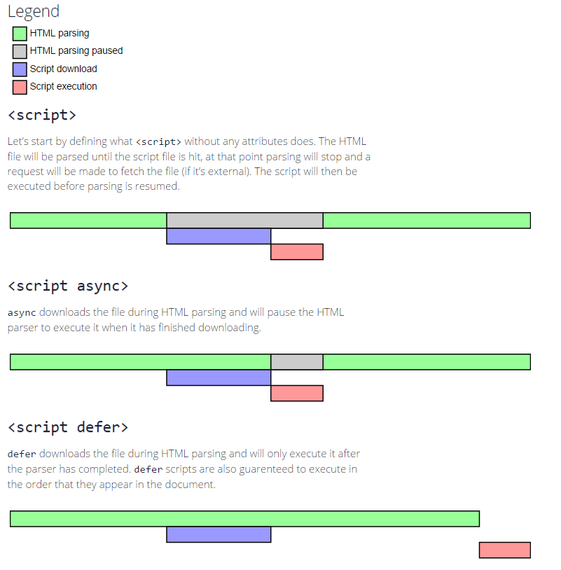 มันจะเริ่มอ่านบรรทัดแรกก่อนค่อยๆ ไล่ทีละบรรทัดลงมาตามลำดับ ทีนี้เมื่อมาถึงบรรทัดที่เป็น JavaScript มันก็จะรอให้สคริปต์นี้โหลดให้เสร็จและทำการรันสคริปต์ จากนั้นมันจึงค่อยอ่านบรรทัดต่อไปเรื่อยๆ ซึ่งกว่าจะแสดงผลมันก็ใช้เวลานาน ตรงที่ต้องมานั่งรอโหลดและรันสคริปต์ JavaScript นี่แหละ