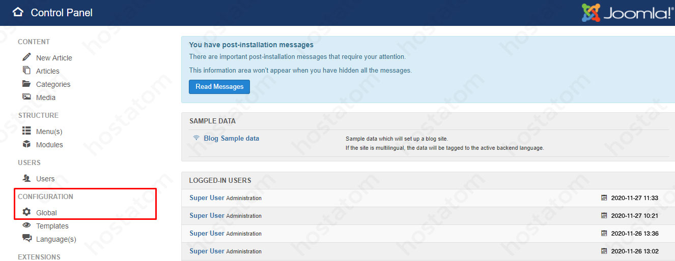 1. Login เข้า Admin Area ของ Joomla ก่อนจากนั้นไปที่ Configurations => Global