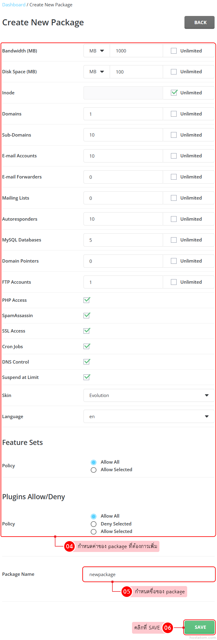กำหนดค่าของ package ที่ต้องการเพิ่ม เมื่อเสร็จแล้วให้กำหนดชื่อของ package แล้วคลิกที่ SAVE