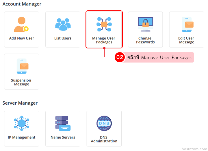 คลิกที่ Manage User Packages ในหมวด Account Manager