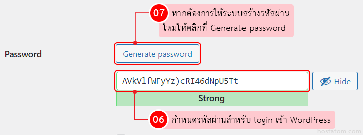 กำหนดรหัสผ่านสำหรับ login เข้า WordPress (ระบบจะสร้างรหัสผ่านมาให้ก่อน) สามารถเปลี่ยนเองได้ในช่อง Password หรือจะให้ระบบสร้างรหัสผ่านใหม่โดยคลิกที่ Generate password