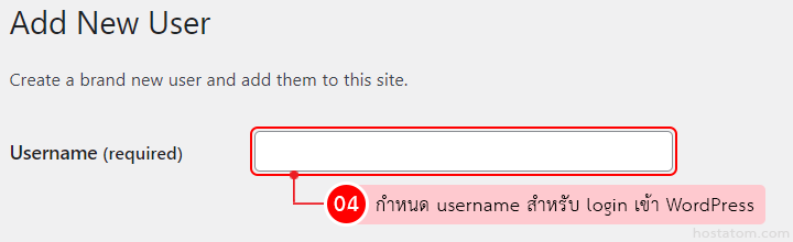 กำหนด username สำหรับ login เข้า WordPress ในช่อง Username (required)