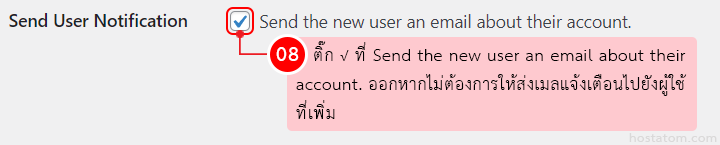 หากไม่ต้องการให้ส่งเมลแจ้งเตือนไปยังผู้ใช้ที่เพิ่มให้ติ๊กถูกที่ Send the new user an email about their account. ออก