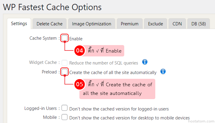 ติ๊กถูกที่ Enable ในหัวข้อ Cache System จากนั้นติ๊กถูกที่ Create the cache of all the site automatically ในหัวข้อ Preload