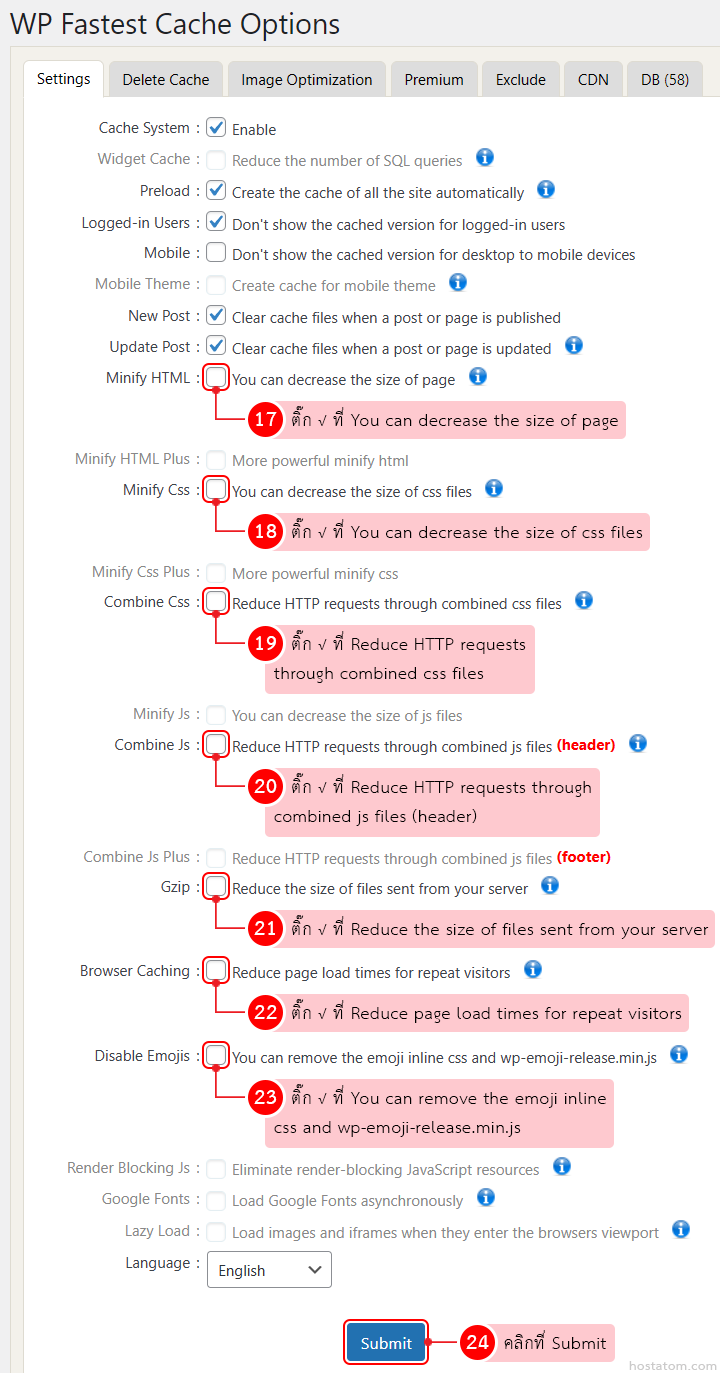 กำหนดการตั้งค่าส่วนที่เหลือ (ติ๊กถูกตามรูปตัวอย่าง) จากนั้นคลิกที่ Submit