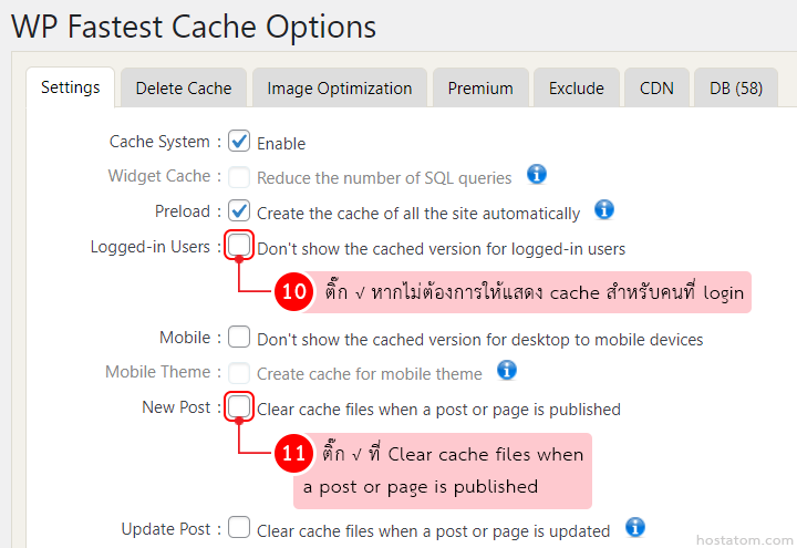 ติ๊กถูกที่ Don’t show the cached version for logged-in users ในหัวข้อ Logged-in Users หากไม่ต้องการให้แสดง cache สำหรับคนที่ login (ถ้ามีคนดูแลเว็บไซต์หลายคนไม่แนะนำให้เลือก) จากนั้นติ๊กถูกที่ Clear cache files when a post or page is published ในหัวข้อ New Post