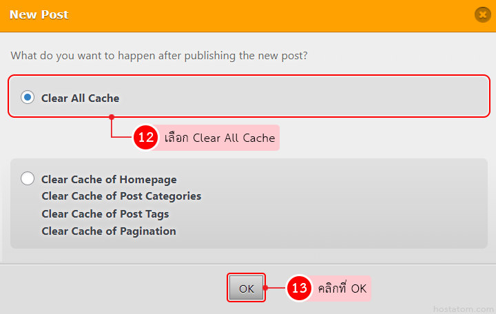 เลือกการลบ cache เมื่อสร้าง page และ post ใหม่ เป็น Clear All Cache จากนั้นคลิกที่ OK