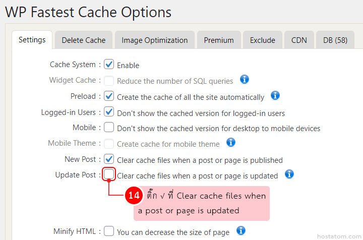 ติ๊กถูกที่ Clear cache files when a post or page is updated ในหัวข้อ Update Post