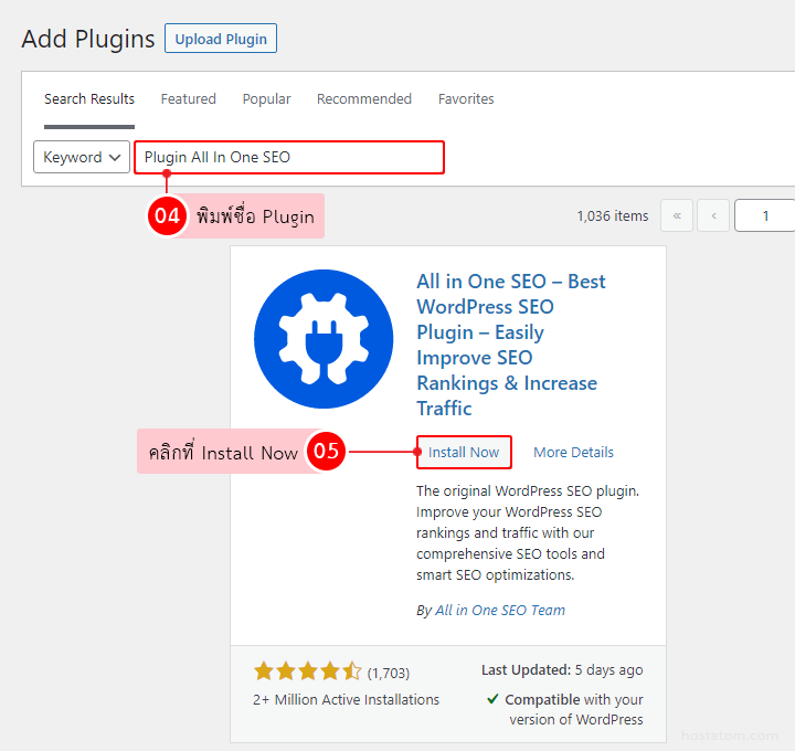 3. ที่ Key Word ให้พิมพ์ Plugin All In One SEO เมื่อค้นหาค้นพบแล้ว ให้คลิกที่ Install Now