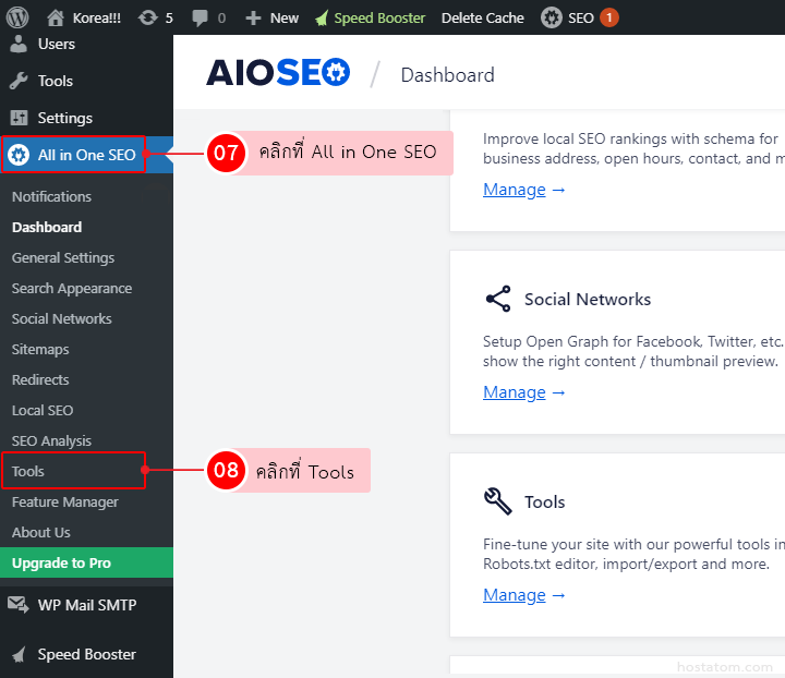 1. เมื่อติดตั้งเรียบร้อยแล้ว กลับไปที่หน้า Dashboard ที่เมนูด้านซ้ายคลิกที่ All in One SEO จากนั้นคลิกที่ Tools